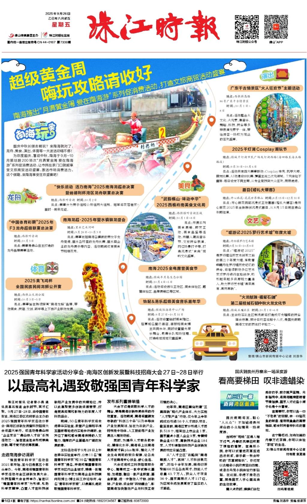 国庆中秋长假去哪玩?来南海就对了,龙舟、美食、演出、体育等一大波活动嗨不停! 为欢度国庆、喜迎中秋,南海于9月~10月策划超200场次“月满黄金周爱在南海游”系列促消费活动,让市民在家门口就能享受文旅商贸活动盛宴,激活市场消费活力。这个假期,来南海享受狂欢盛宴吧! “快乐运动 活力南海”2025南海龙超总决赛暨纳德利杯湾区龙舟联赛总决赛 地点:西樵听音湖时间:10月2日 亮点:赛事分为男子组和公开组两大组别。冠军将花落谁家?届时一起来见证。 “中国体育彩票”2025年F3龙舟超级联赛总决赛 地点:西樵听音湖时间:10月3日 亮点:赛事是佛山自主打造的龙舟品牌赛事活动。 南海龙超·2025年里水镇锦龙盛会 地点:里水艺术河畔 时间:9月28日~10月3日 亮点:赛事包括南海各镇街的男女子龙舟竞速、里水各村居的龙舟比赛、里水商企业的龙舟展示等内容。活动期间还有美食节和烟花秀。 2025黄飞鸿杯全国民族民间龙狮公开赛 地点:西樵山天湖公园时间:10月3日~5日 亮点:赛事旨在持续擦亮“南海龙超”品牌,带动美食、民宿、文创、研学等上下游产业联动发展。